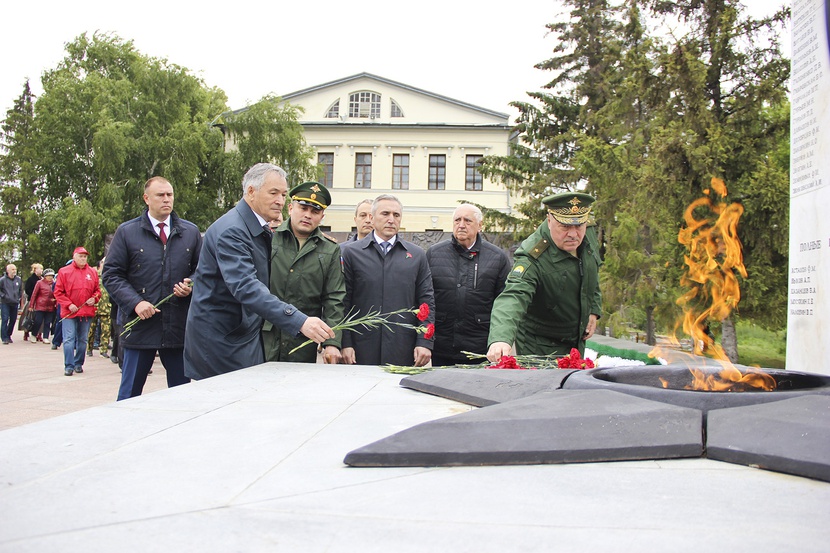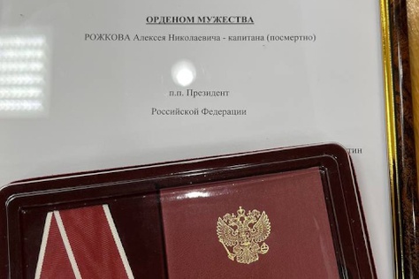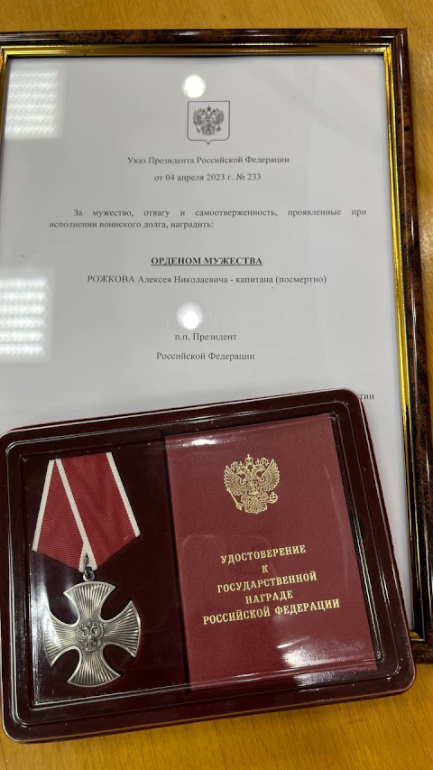 "caption": "Военный комиссар Ленинского и Восточного административных округов города Тюмени Алексей Репин передаёт орден Мужества Николаю Рожкову.",