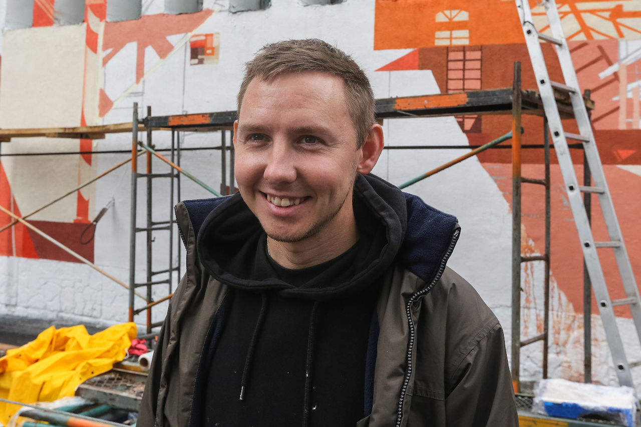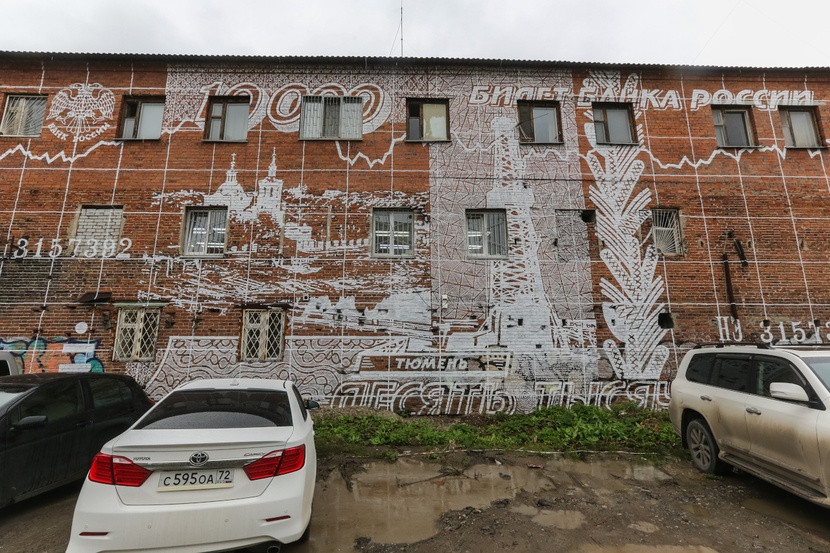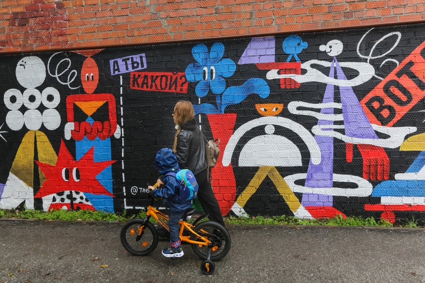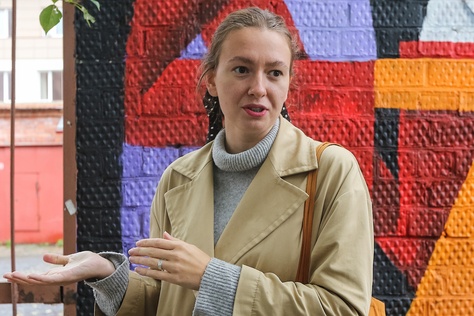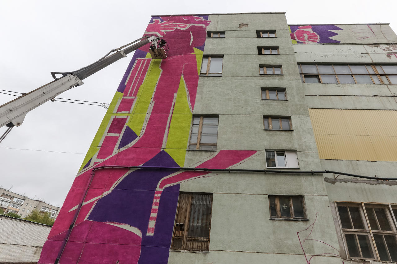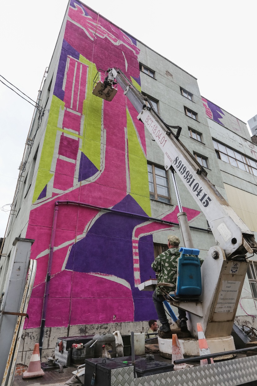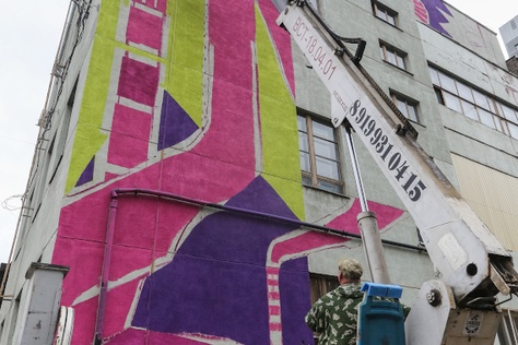 "caption": "Юлия Саначина на фоне работы Тины Прохоровой.",