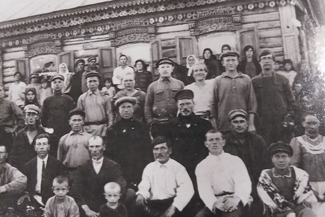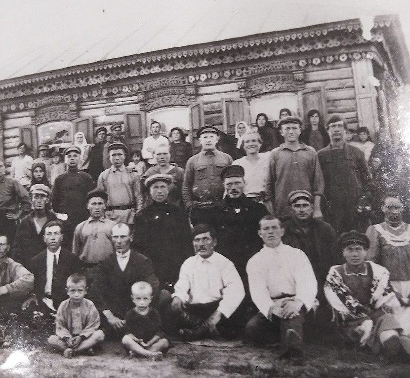 "caption": "Иван Усенко с активистами колхоза села Михайловка Кустанайской области (он в белой рубашке в центре).",