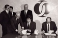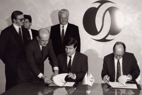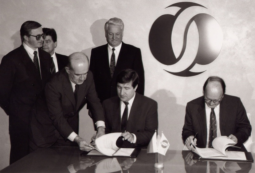 "caption": "Глава администрации Тюменской области Юрий Шафраник (слева) подписывает в Лондоне соглашение с Европейским банком реконструкции и развития. На заднем плане — заместитель председателя Правительства РФ Александр Шохин и Президент РФ Борис Ельцин. Фото из архива Юрия Шафраника.",